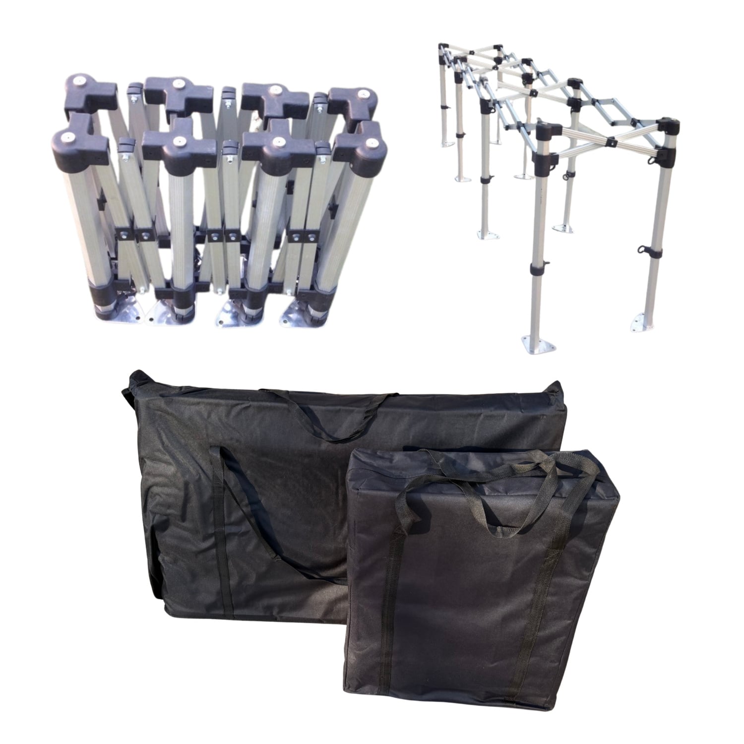 Pop Up Table Available in 2 sizes 3m or 4.5m .Strong & durable, heavy duty, quick and easy to use pop up folding table / trade counter, designed the same way as pop up gazebos with a concertina framework used on the Pop Up Gazebos. The table top folds away into 3 sections and sits on top of the framework with locating slots