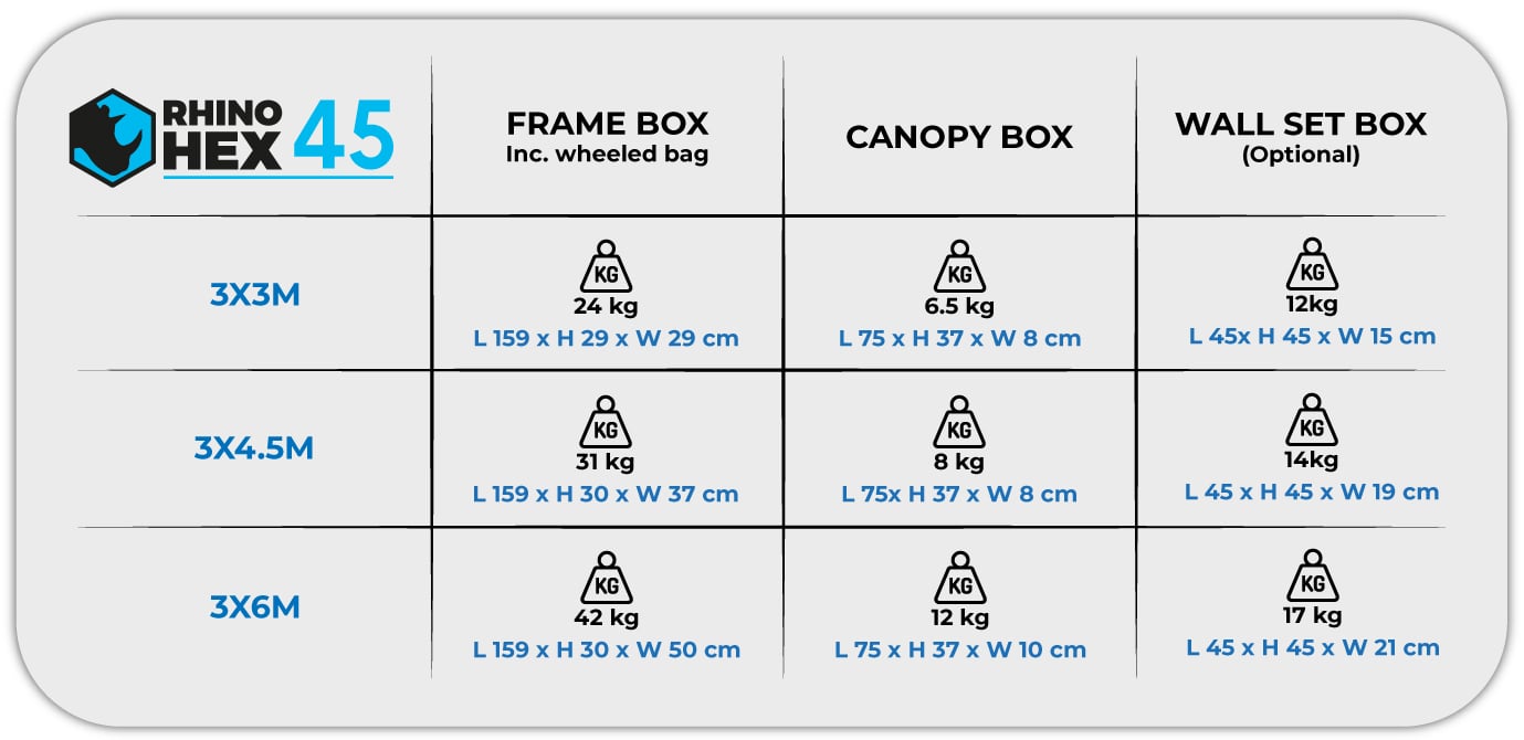 The Rhino HEX 45 is our mid range heavy-duty gazebo, ideal for the commercial customer whom requires a high quality pop-up gazebo that is designed to keep the weight down with out compromising the durability and strength, perfect for market stalls, events, & motor sports.